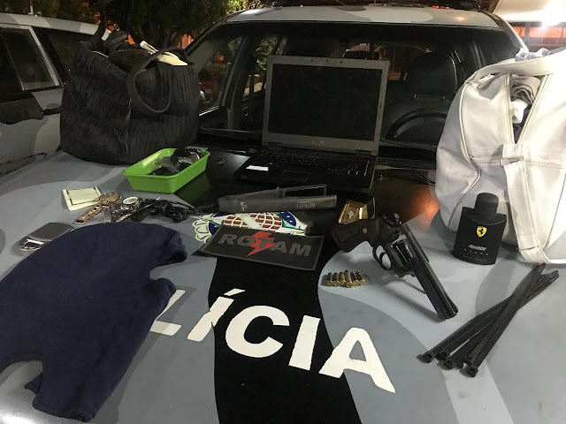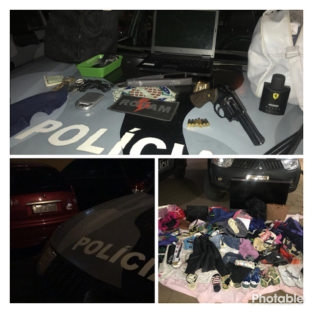 Durante o percurso para a delegacia, já na DF 495, os policiais abordaram um chevette. No interior havia um casal que demonstrou nervosismo. No endereço da suspeita de 25 anos, na QR 402 de Samambaia, foi localizado vários produtos do roubo e um revolver calibre .38 com 06 muniçoes.